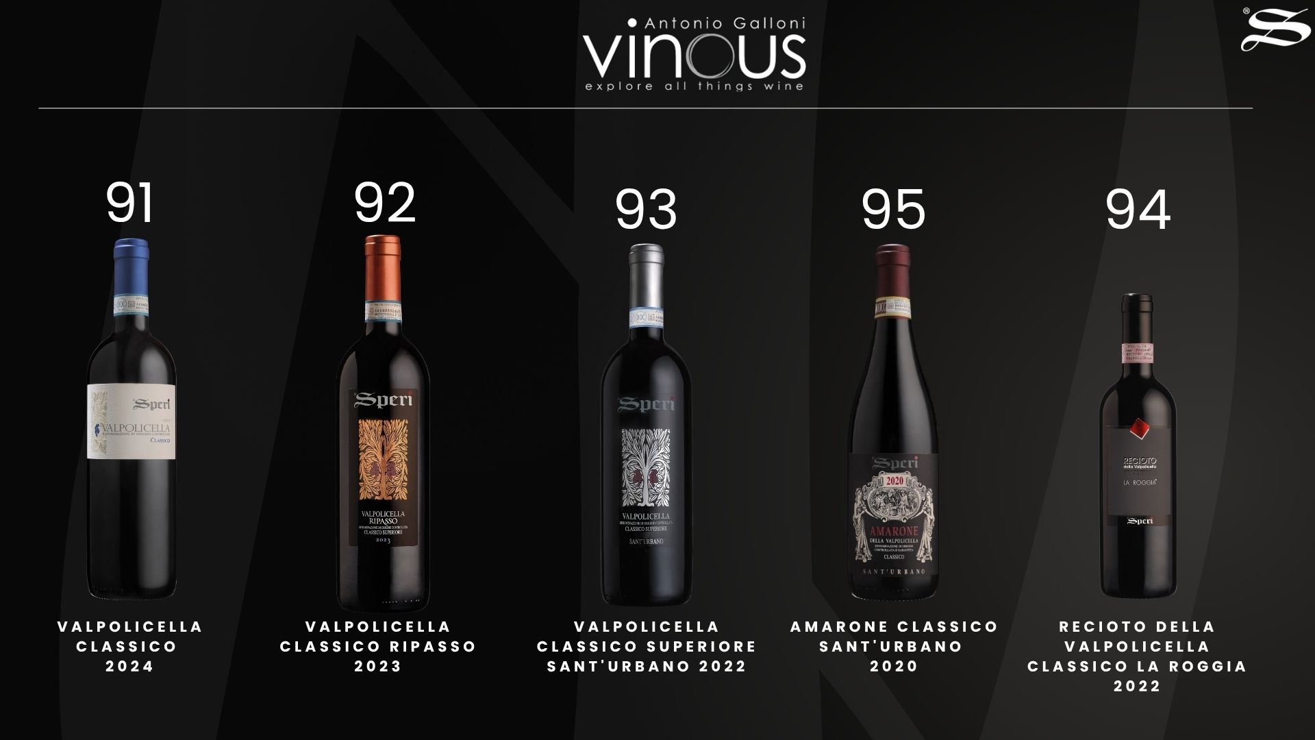 95 punti all’Amarone Classico Sant’Urbano 2020, 94 punti al Recioto Classico La Roggia 2022, 93 punti al Valpolicella Classico Superiore Sant’Urbano 2022, 92 punti al Valpolicella Classico Ripasso 2023 e 91 punti al Valpolicella Classico 2024.